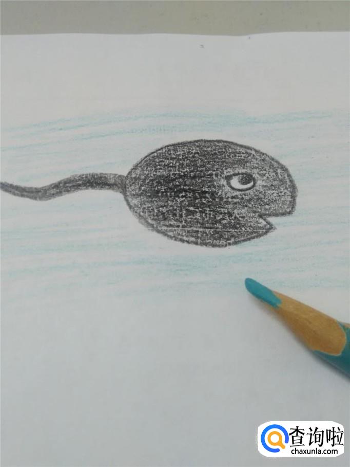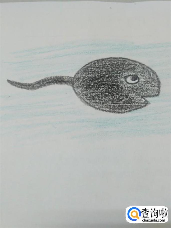 用蓝笔把小蝌蚪的周围涂成浅蓝色,表示水。小蝌蚪就画完了。