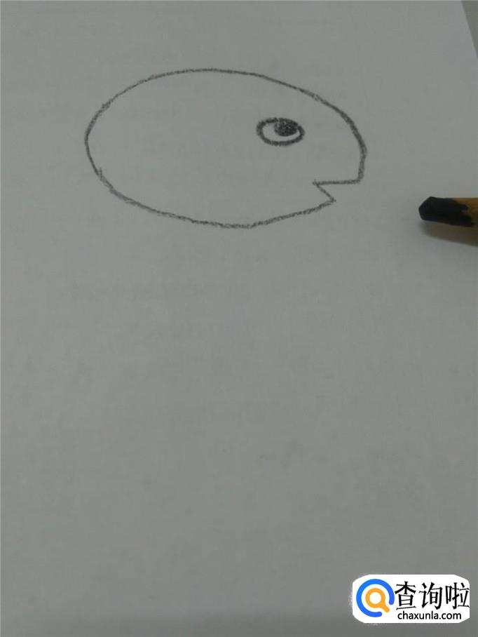 在椭圆的右方画一个小的椭圆形,表示眼睛,在眼睛里画一个椭圆形的黑点,表示眼珠。