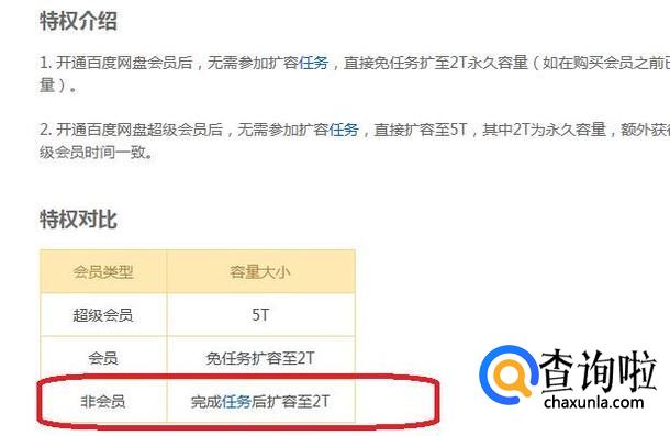 进入的界面是百度网盘的会员特权介绍,我们可以在特权对比表格中,看到有非会员免费扩容的途径。点击图中的“任务”按钮,完成任务即可以扩容到2T容量了。
