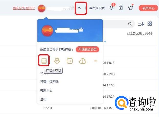 在登陆以后的界面中,如图所示,点击右上方的用户名旁边按钮,在出现的扩展项中点击“5T超大空间”按钮。