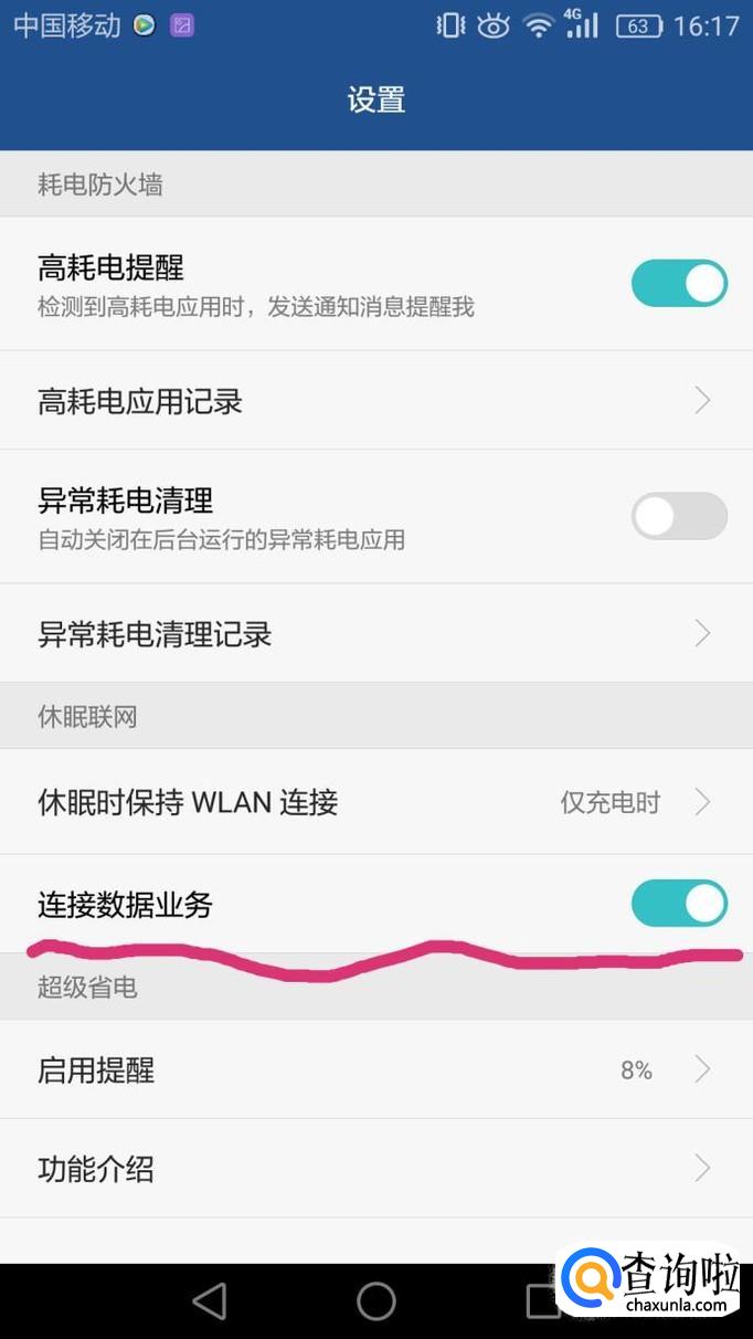 我们先开启连接数据业务,使我们在使用数据时不会因为锁屏而断开。不会导致我们正在下载的东西停止。