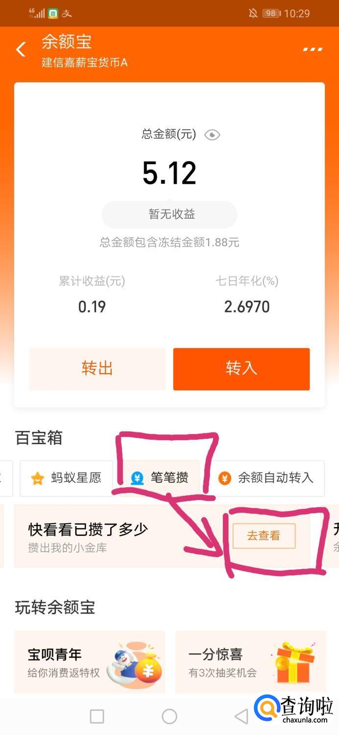 进入余额宝界面后,点击“笔笔攒”,然后点击下方的“查看”(笔笔攒需要开通后才能进入笔笔攒界面噢)。