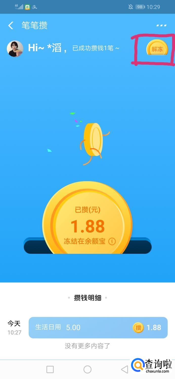 进入笔笔攒界面后,点击右上方“解冻”。