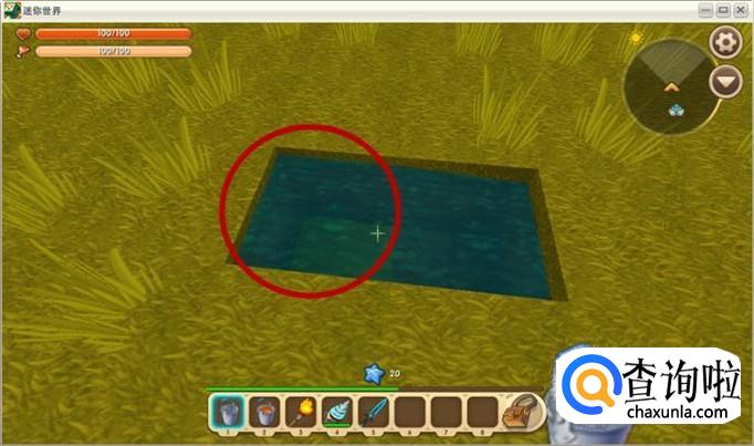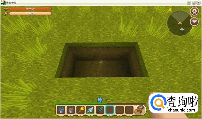 有了岩浆和水,接下来我们要在地上挖一个长2格、宽1格、深1格的坑。如图所示: