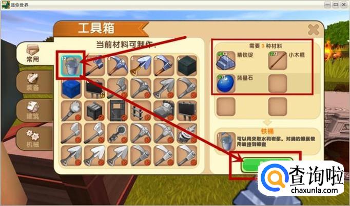 有些人在地下怕被怪物打死,那么这里还有另一种方法,就是自己制作:首先,让我们打开工具箱制作一些铁桶。如图所示: