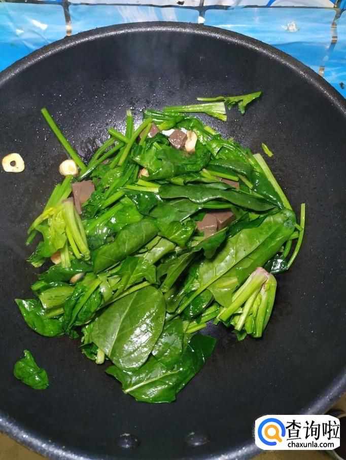 将准备好的菠菜倒入锅中,炒至菠菜变软,然后再加少许清水,这样可以让菠菜更嫩一些。