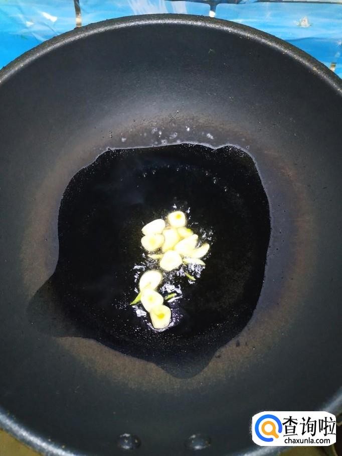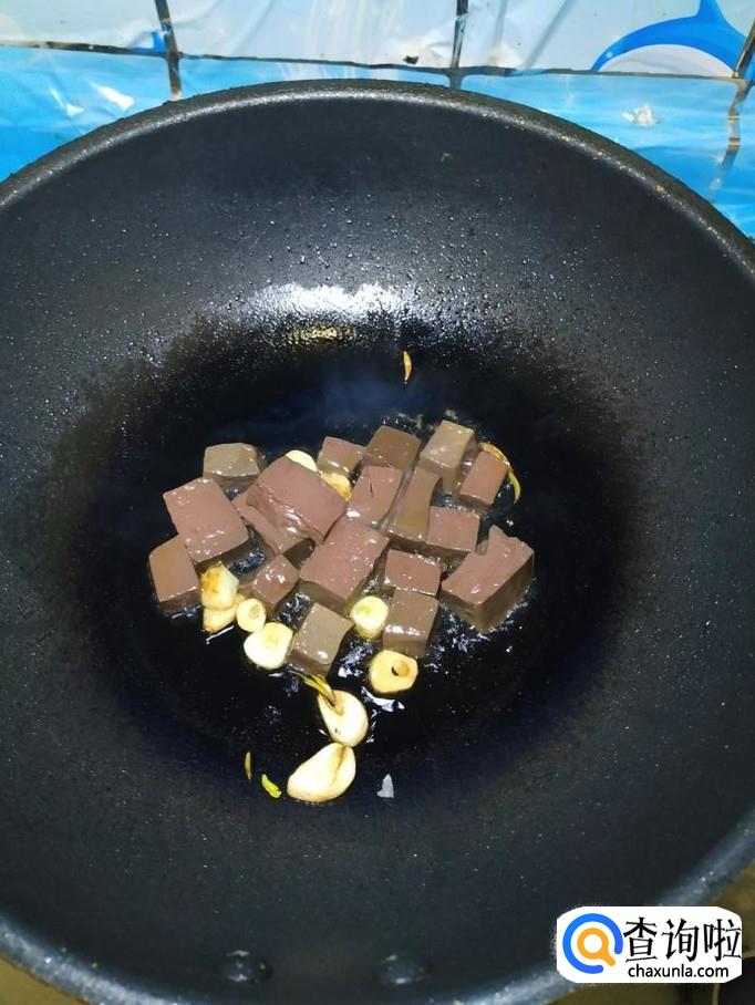 准备适量蒜,洗净后切成片,炒锅中放入适量油,油热后,将蒜片儿倒入锅中炒香,然后将猪血倒入锅中,翻炒均匀。