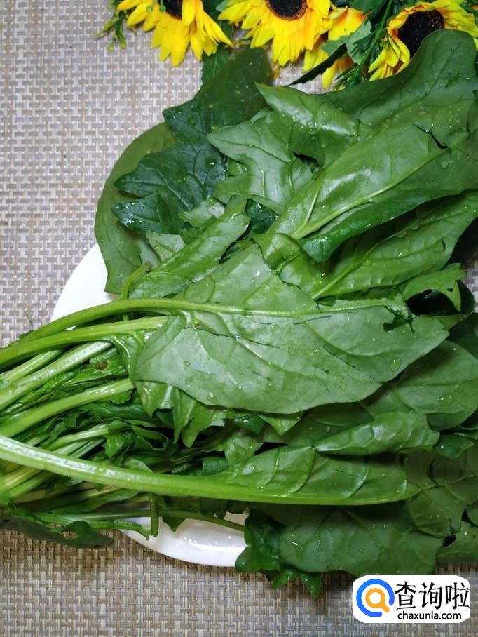 准备适量菠菜,洗净后,切成长段,放入盘中备用。