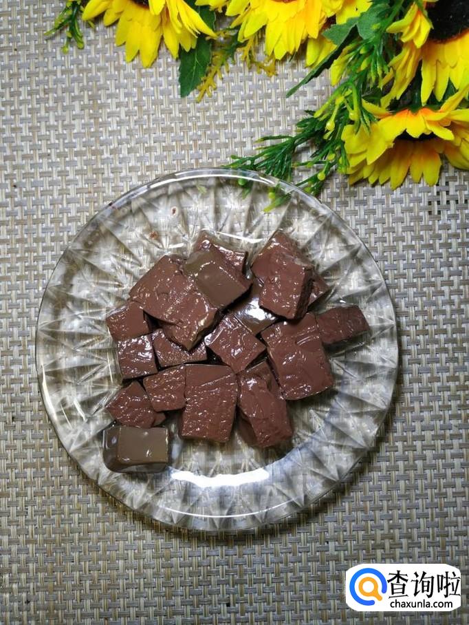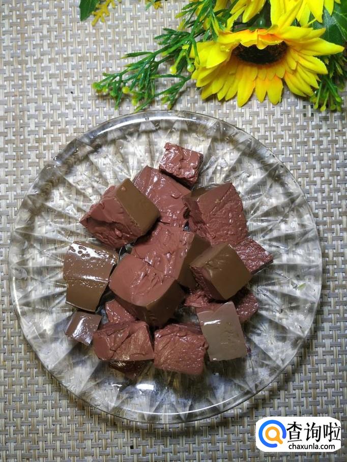 准备适量猪血,切成块状,放入盘中备用。