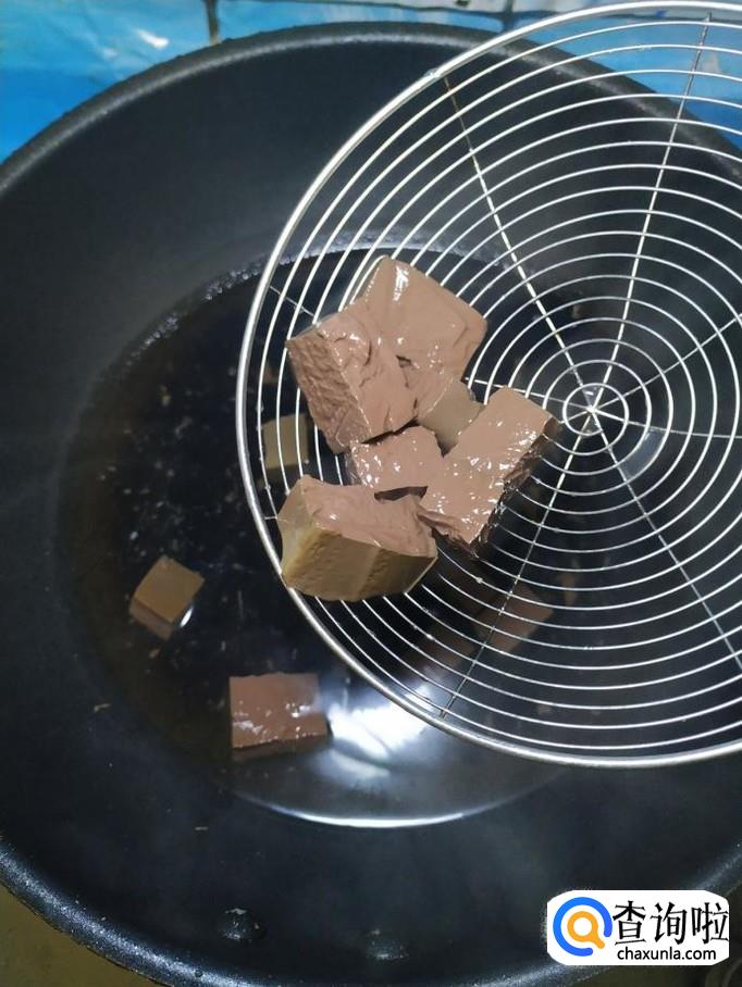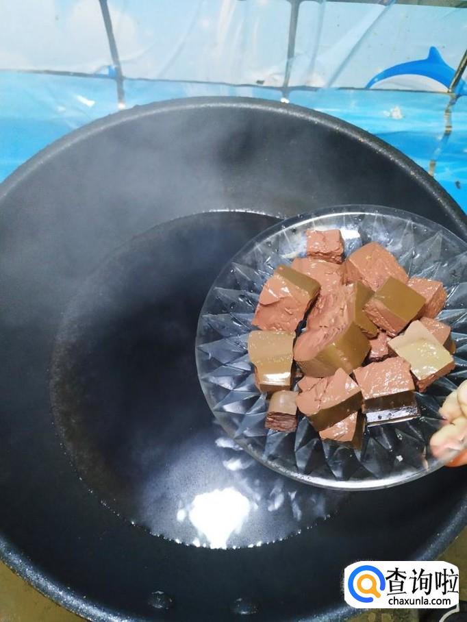 锅中烧开水,水开后将猪血放入锅中焯水,焯好后捞出,这样可以有效去除猪血的腥味。