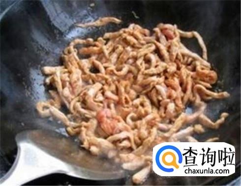 锅里到油烧热,直接把腌制十几分钟的肉丝倒进锅里,用筷子划而不是用铲子,记住了哦。用筷子不断的划动肉丝,让其在油里面均匀受热,肉变色之后加一点点热水炒熟,撒一把葱花就可以了。