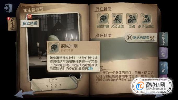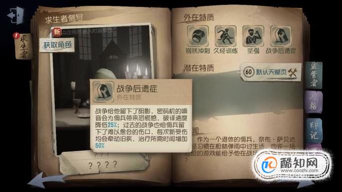 佣兵参与战争,战争给佣兵留下了阴影,在破译密码机时,会发出噪音,这个噪音会给佣兵带来恐慌感,使得破译密码机的速度降低。而且战争也给佣兵留下了难以愈合的伤口,每次监管者打伤佣兵都会牵动他的旧疾,使他治疗所需时间增加。