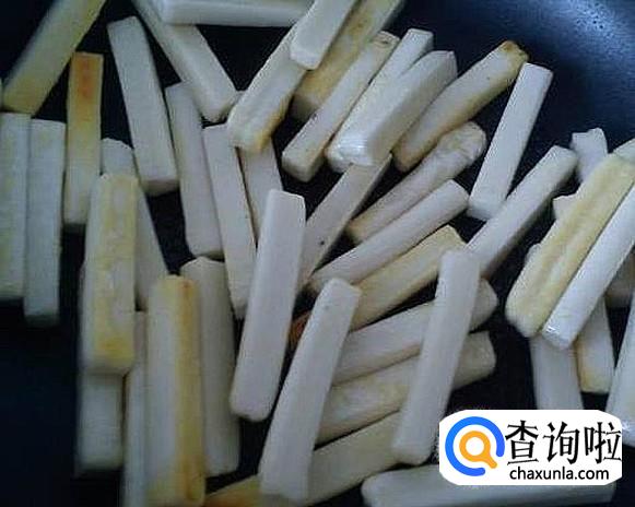 在锅内放入适量色拉油,油温6成热时放入年糕条煎制,要不停的翻面,以防煎糊。