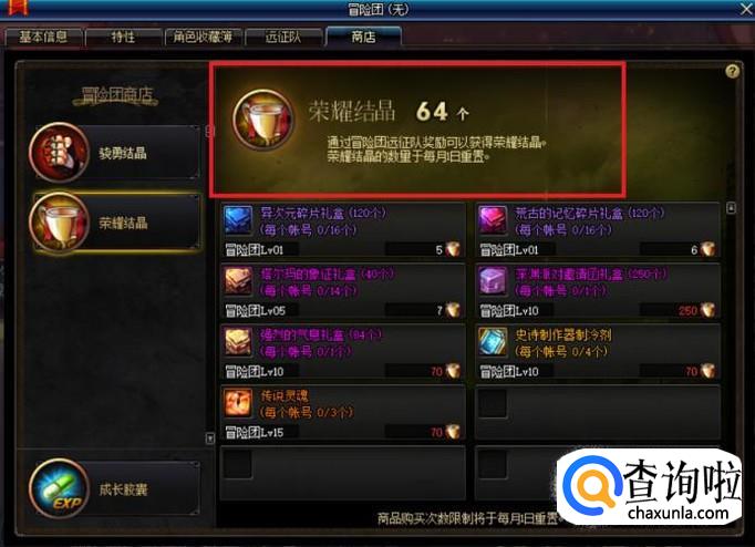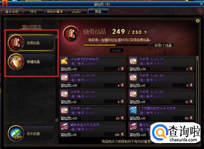 在冒险团商店中,我们可以分别看到我们所拥有的荣耀结晶和骁勇结晶的数量,其中,每当角色获得的经验值,达到一定量后,便可获得一个骁勇结晶。