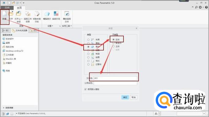 打开软件,点击“新建”,在“新建”对话框选择“零件”,然后选择“实体”,文件名以“001”为例,如图所示。