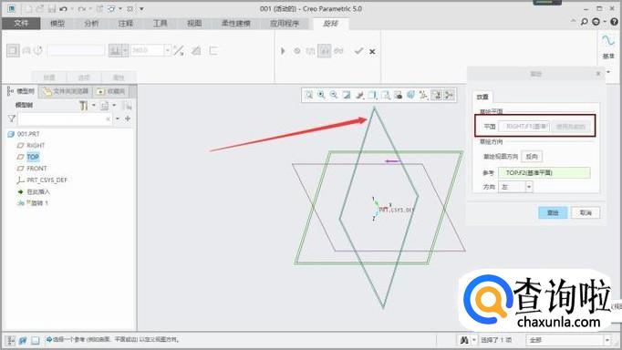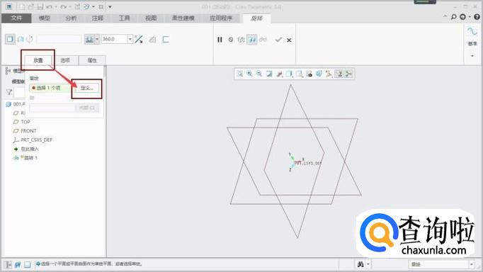 在旋转操作页面,点击“放置”,然后选择“定义”,设置“参考平面”,如图所示。