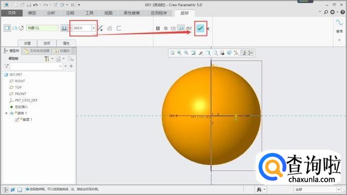 在旋转页面将旋转角度设置为360度,点击“对勾”即可完成球体的绘制,如图所示。