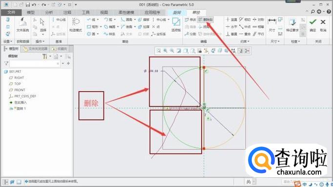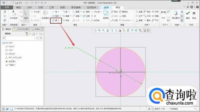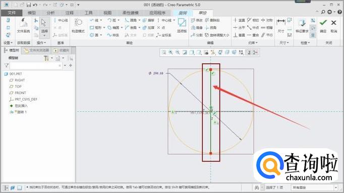 点击“圆”的指令,以坐标轴原点为圆心在草绘页面画一个200MM的圆,如图所示。