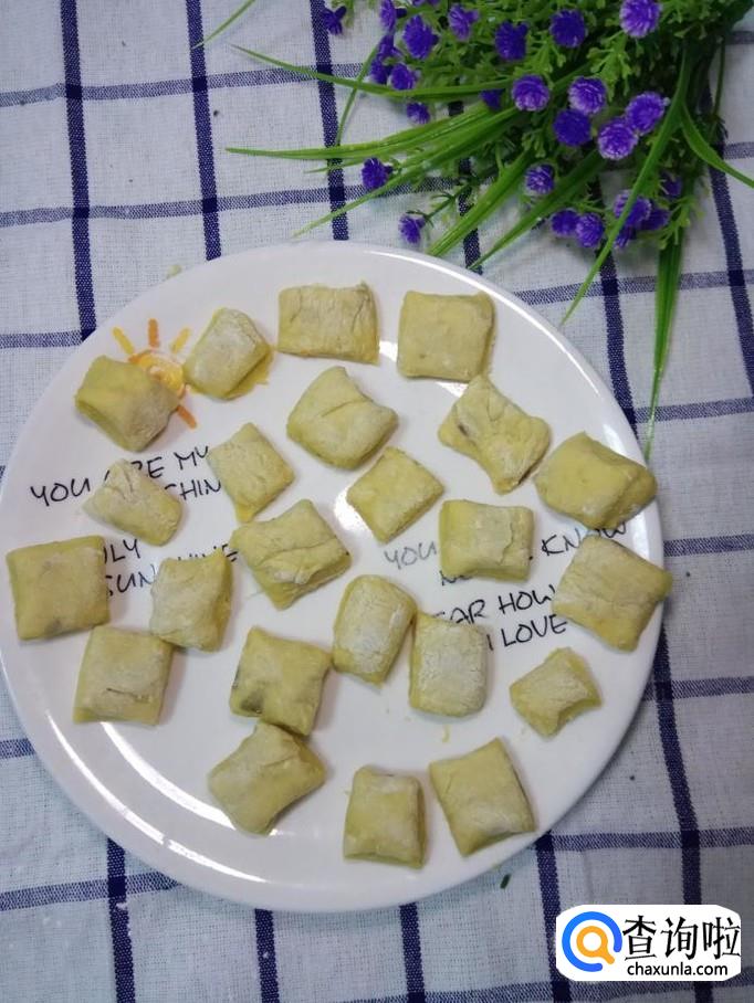 擀成一到两厘米厚的厚片儿,然后用刀切成条,再切成小块。