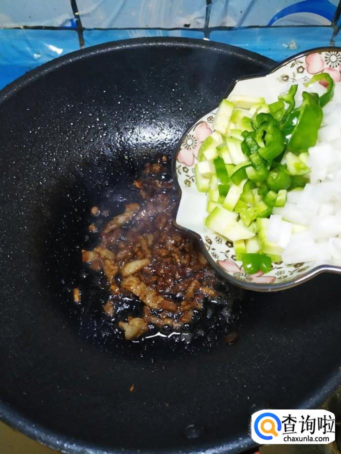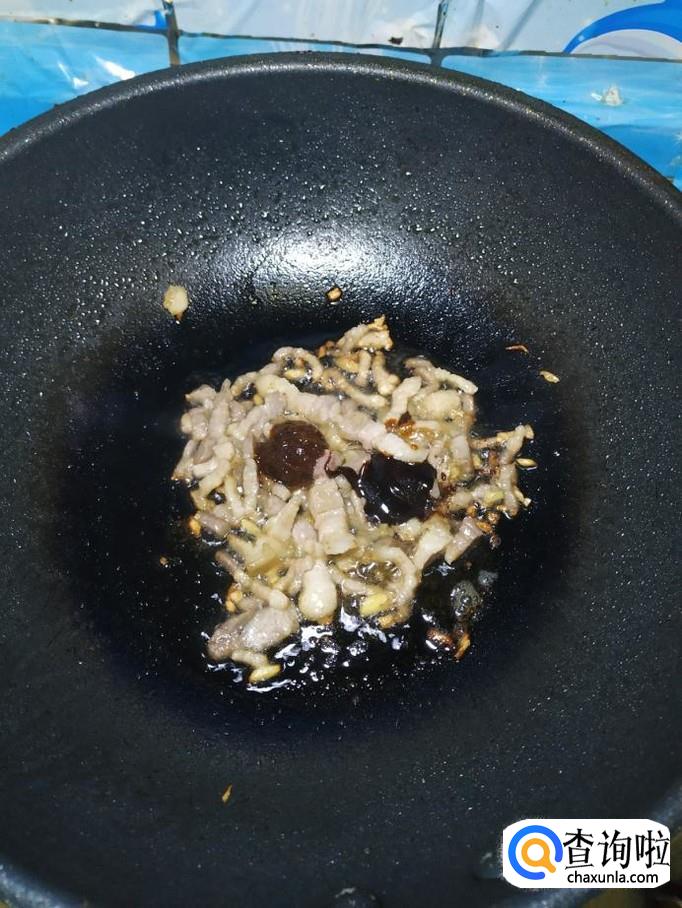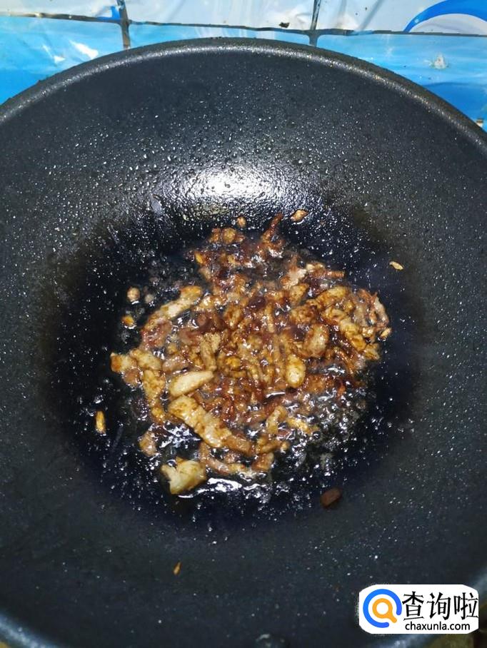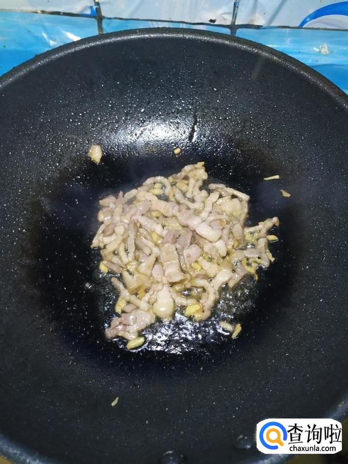 炒锅中放入适量油,油热后,将肉丝放入锅中炒香。