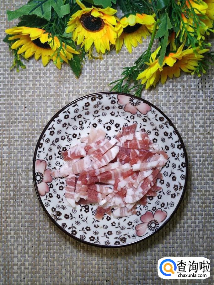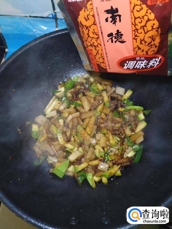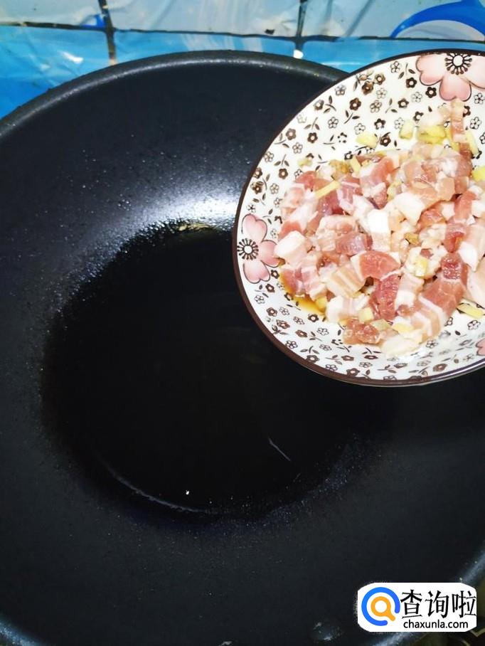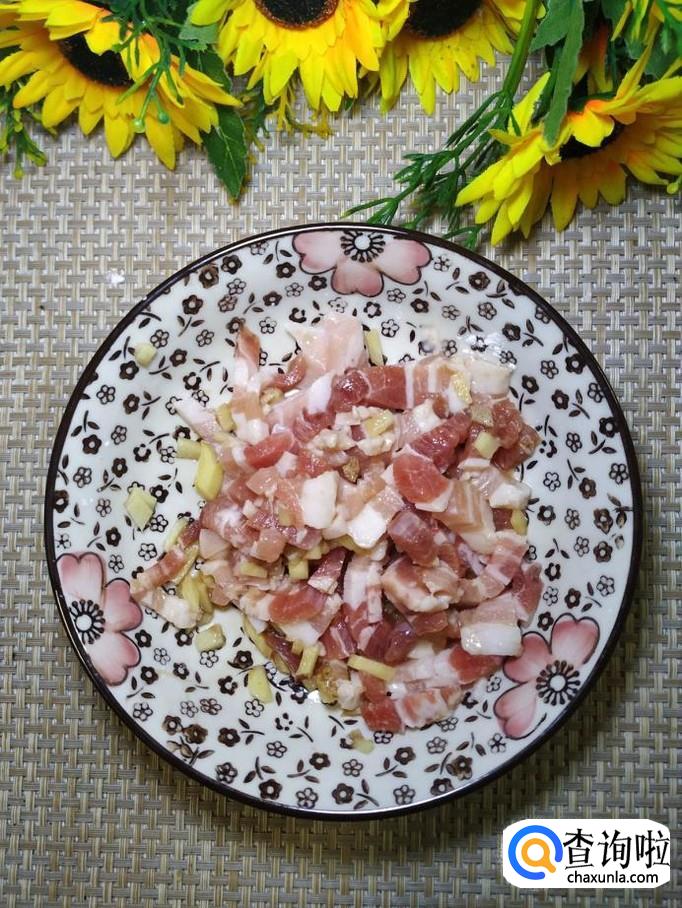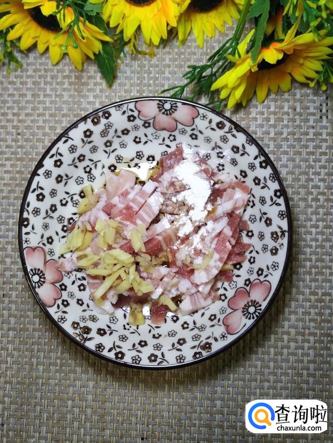 准备适量五花肉,洗净后切成肉丝,再准备适量生姜,切碎放在上面,加入适量盐,鸡精,五香粉,生抽,料酒,搅拌均匀,腌制十分钟。