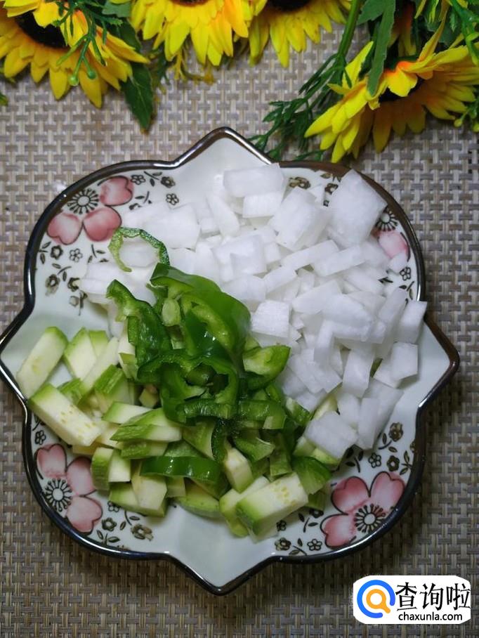 准备适量青椒,西葫芦,白萝卜,把它们洗净后切成小丁,放入盘中备用。