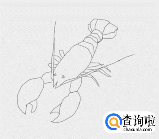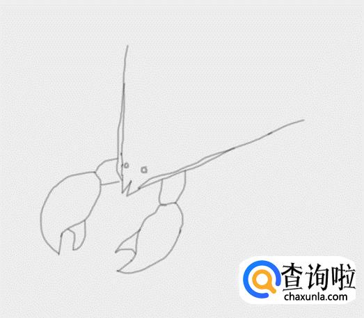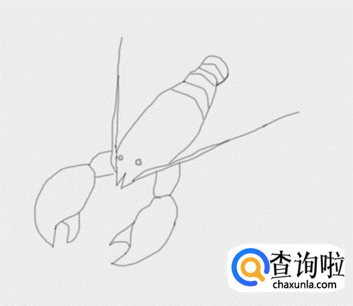 在虾钳的基础上我们再画出龙虾的头部,再在头部上画出龙虾的须部,,然后在画出龙虾的两只眼睛,如图所示: