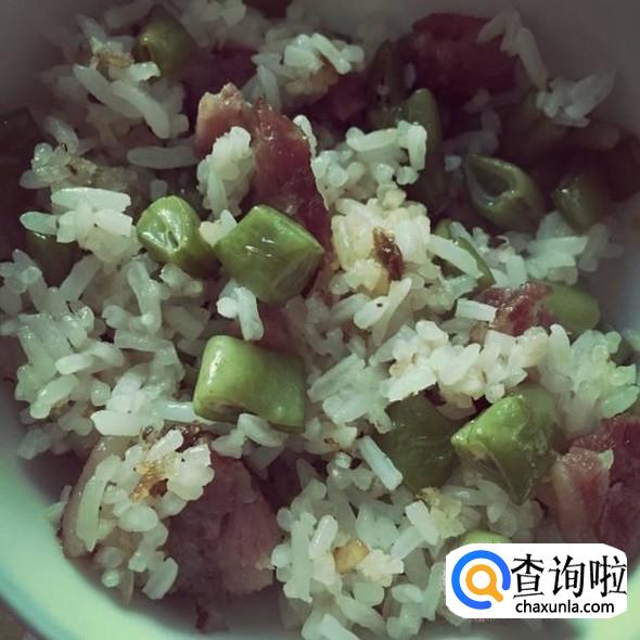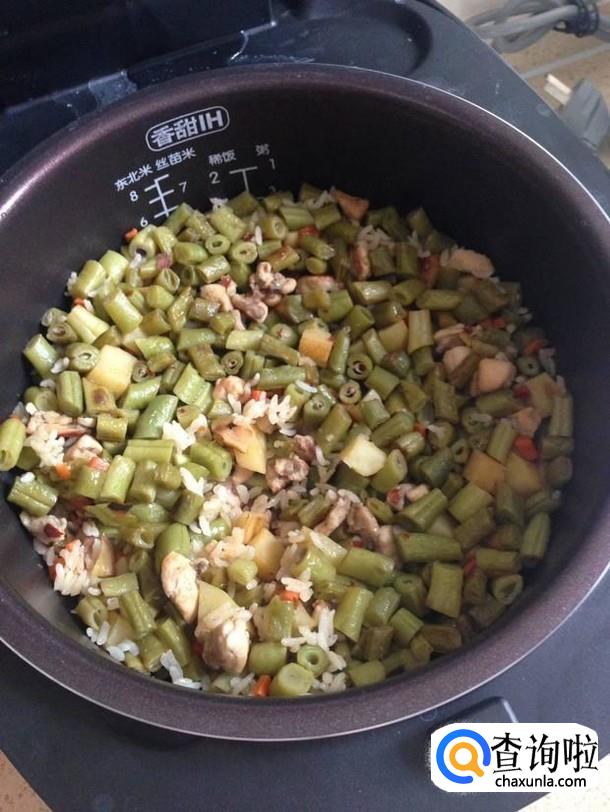 大米淘洗干净后放入电饭煲中,加入适量水,然后将炒好的豆角倒入进去,按至蒸米键,米饭蒸熟就可以了。