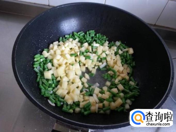 锅中加入适量植物油,油热后倒入切好的肉丁,翻炒至变色,然后倒入豆角和土豆丁,加入适量盐,味极鲜和鸡粉,翻炒均匀,不用炒太久。