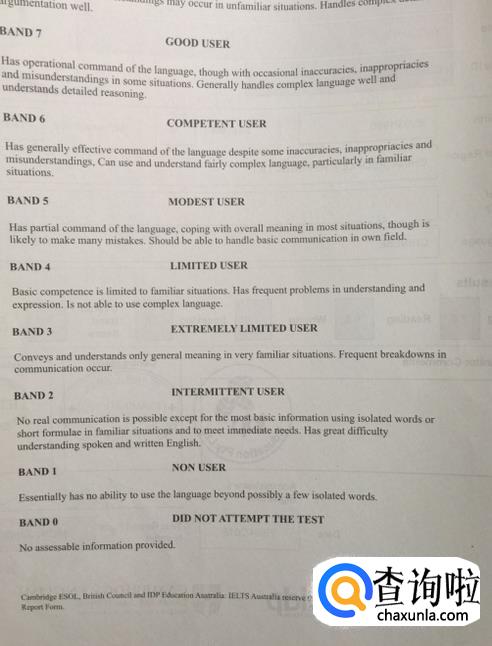 第四、每张雅思成绩单背面都会有band说明,以下为样式。