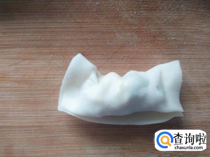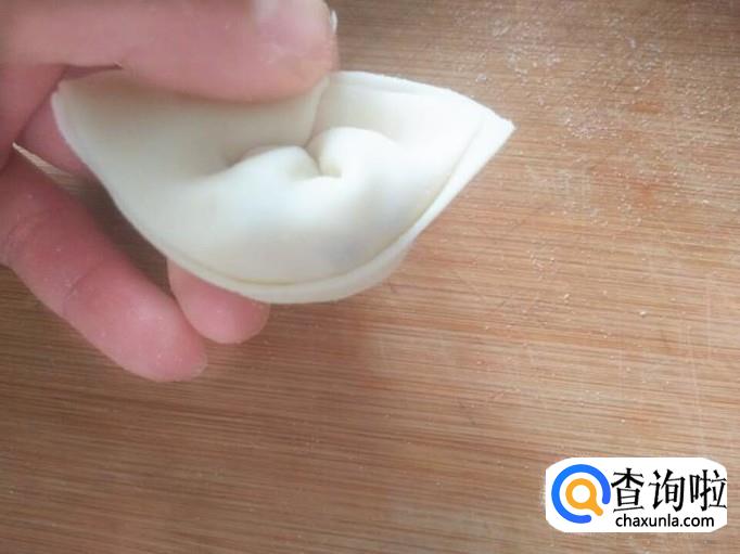 将馄饨的两头往里轻轻一拉,然后用大拇指捏一下,将小馄饨做成小元宝的形状。