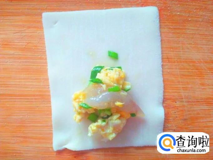 一筷子馅直接放进一张馄饨皮上,不要太多但也别太少了,不然小馄饨吃起来不鲜亮。