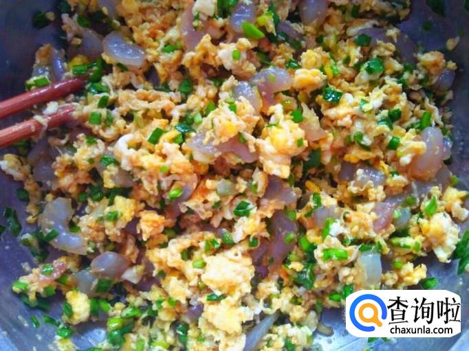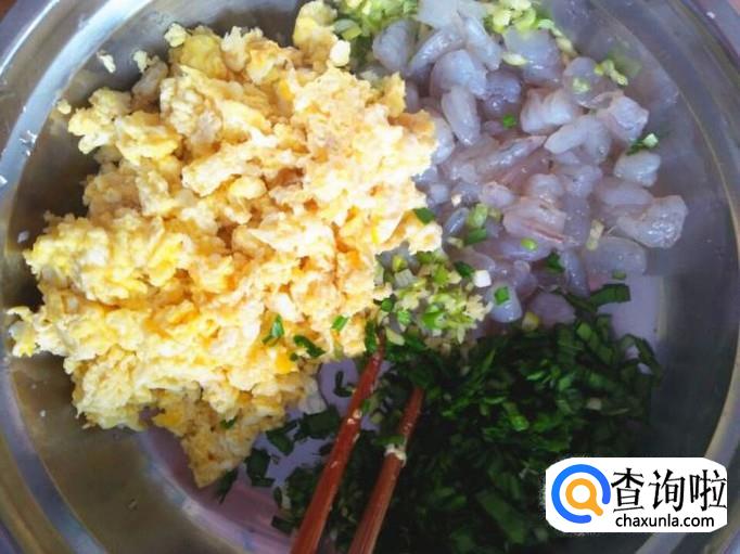 将鸡蛋碎、虾仁、韭菜末和生姜末放在一起。
