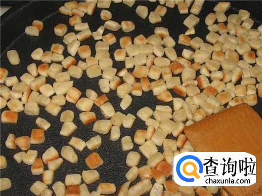 发酵好后,用擀面杖把面团擀平,不是很薄,擀平就可以了。擀平之后用刀具把面块切成半厘米长条,然后切成小面丁。将小面丁刷上食物油,不喜欢吃腻的人可以少刷点油。
