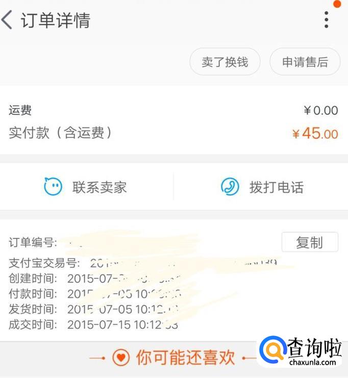 还可以点击订单,跳转到详情界面,查看订单编号和交易时间,如果还想再次购买,可以点击卖家旺旺,和卖家联系是否有货。