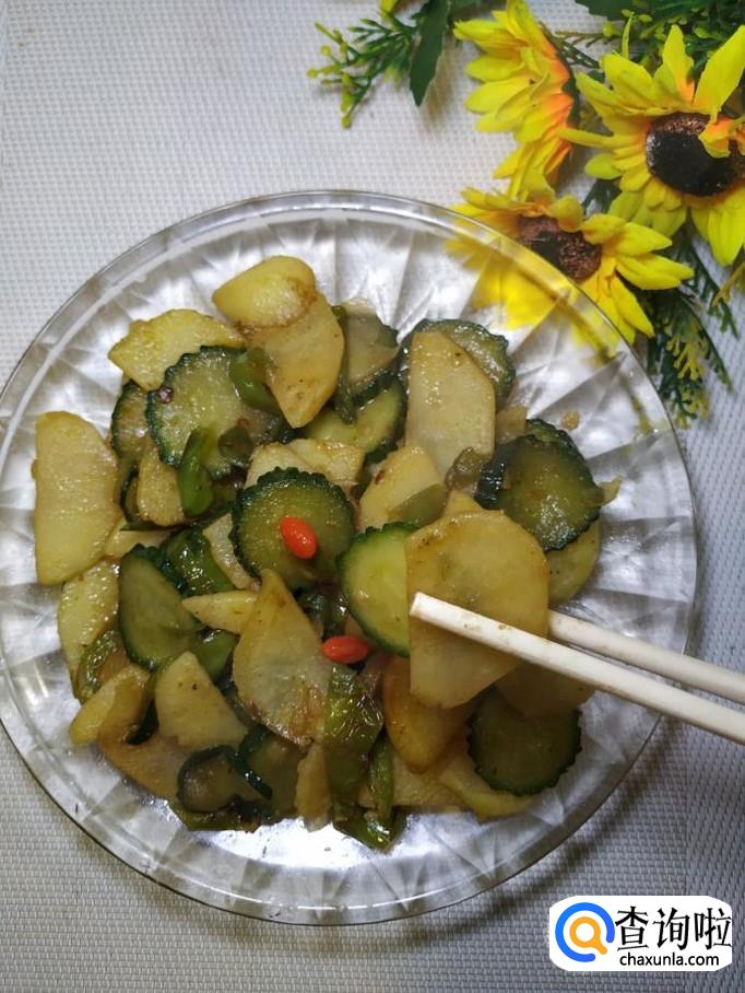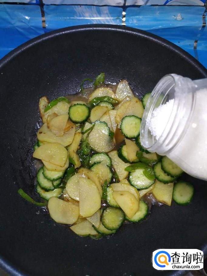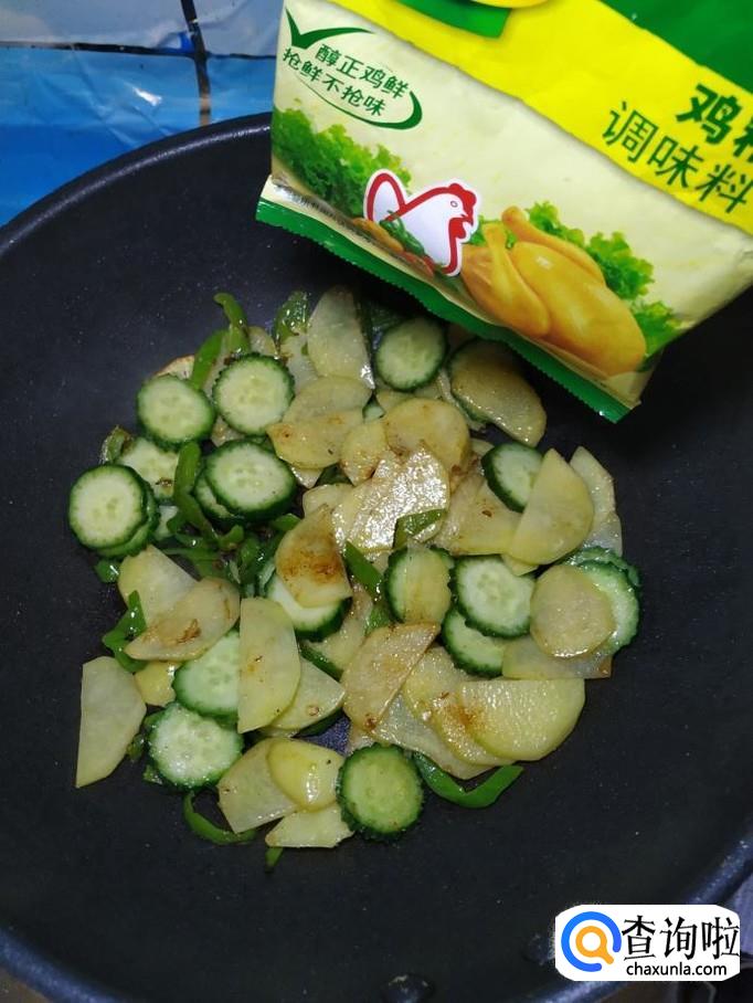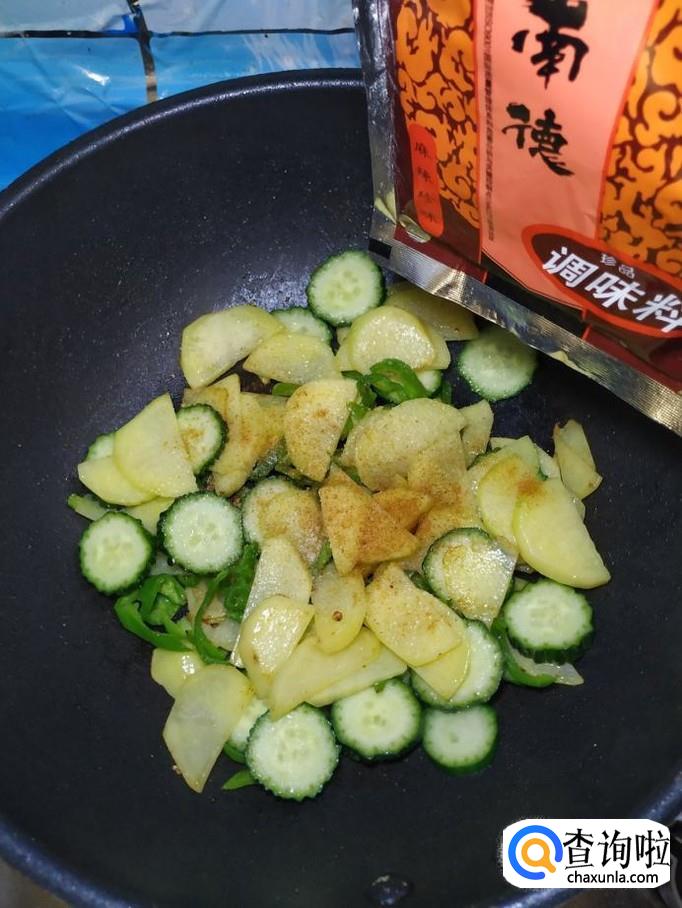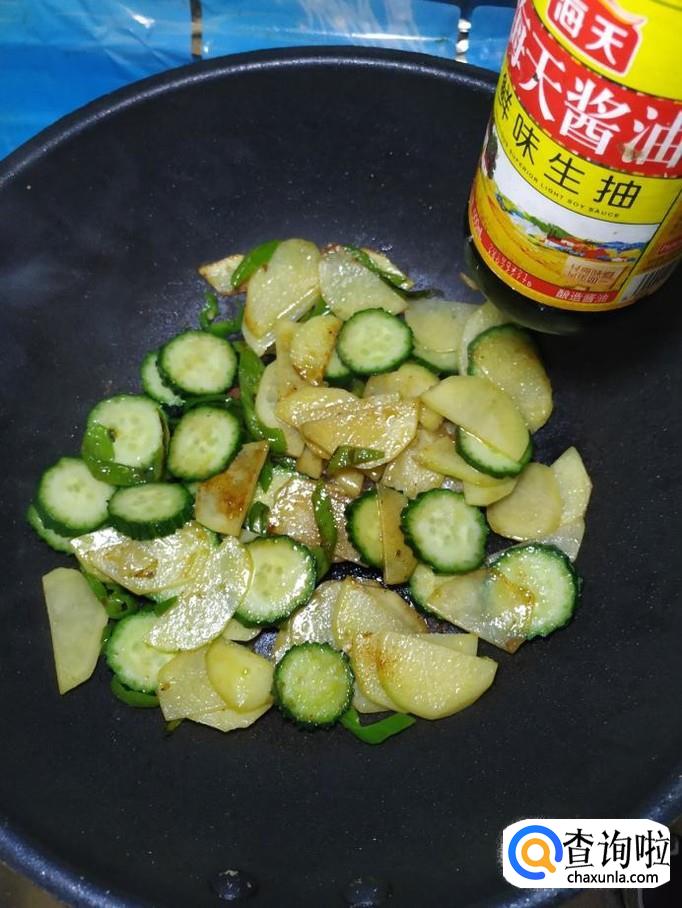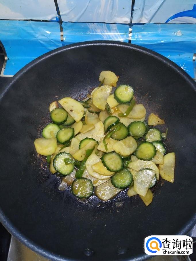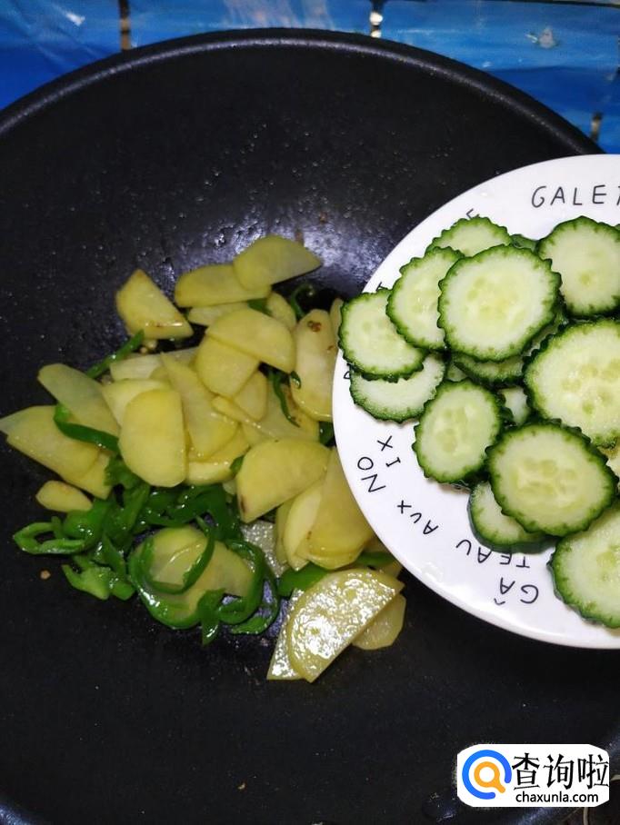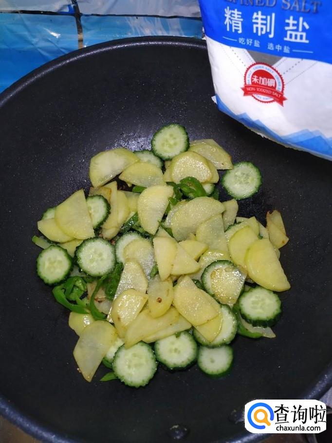 炒至土豆表面微微发黄,大约七八成熟的时候,将准备好的黄瓜倒入锅中,翻炒均匀,加适量食盐调味。