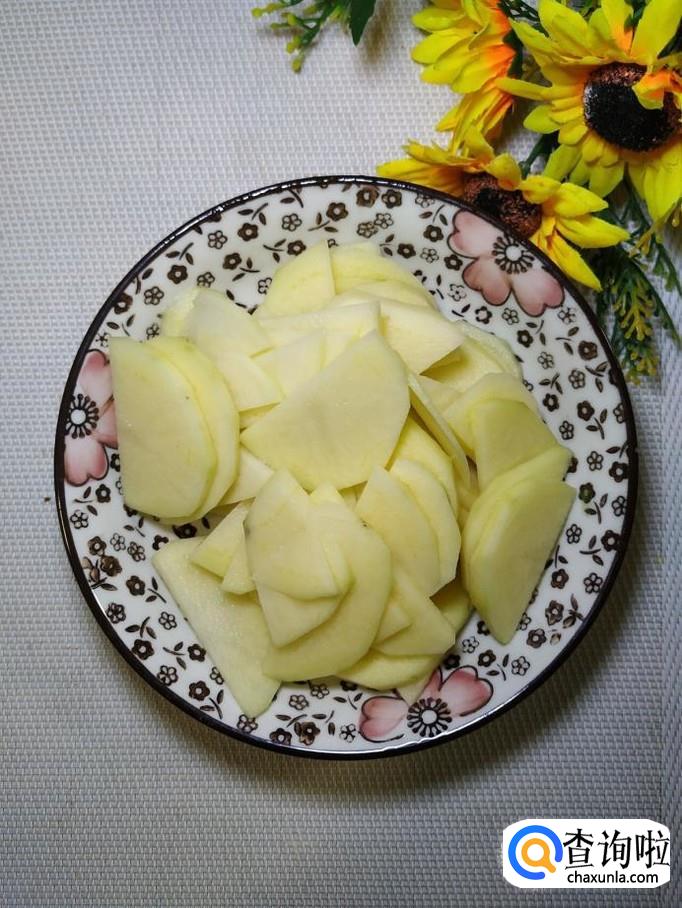 准备一个土豆,洗净后,去皮,切成片儿,洗去淀粉,放入盘中备用。注意,土豆的片儿,可以切得稍微厚一点儿,这样口感更好。