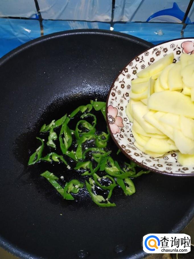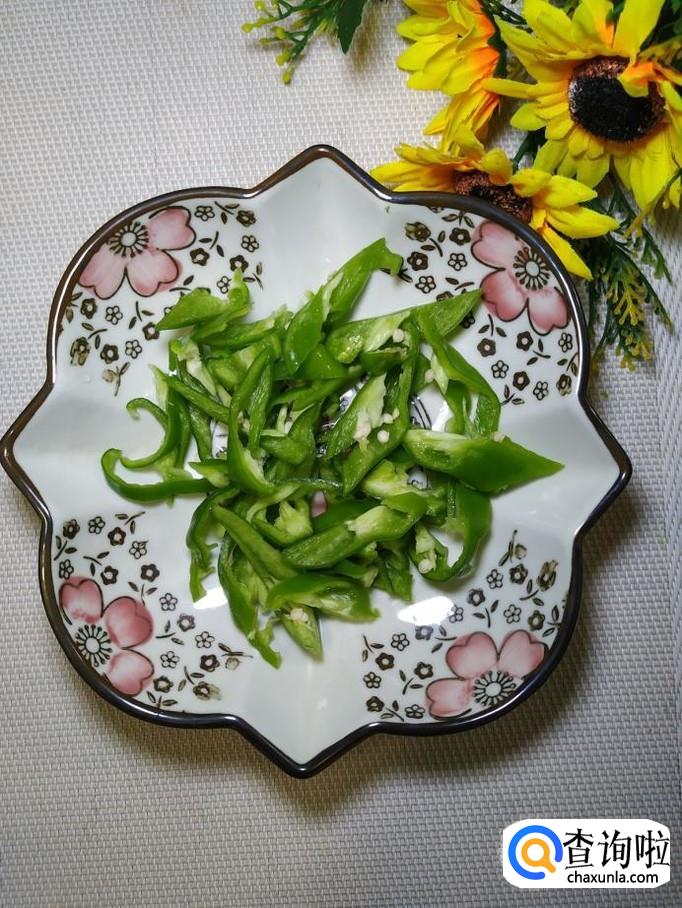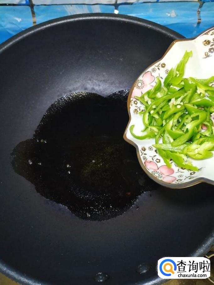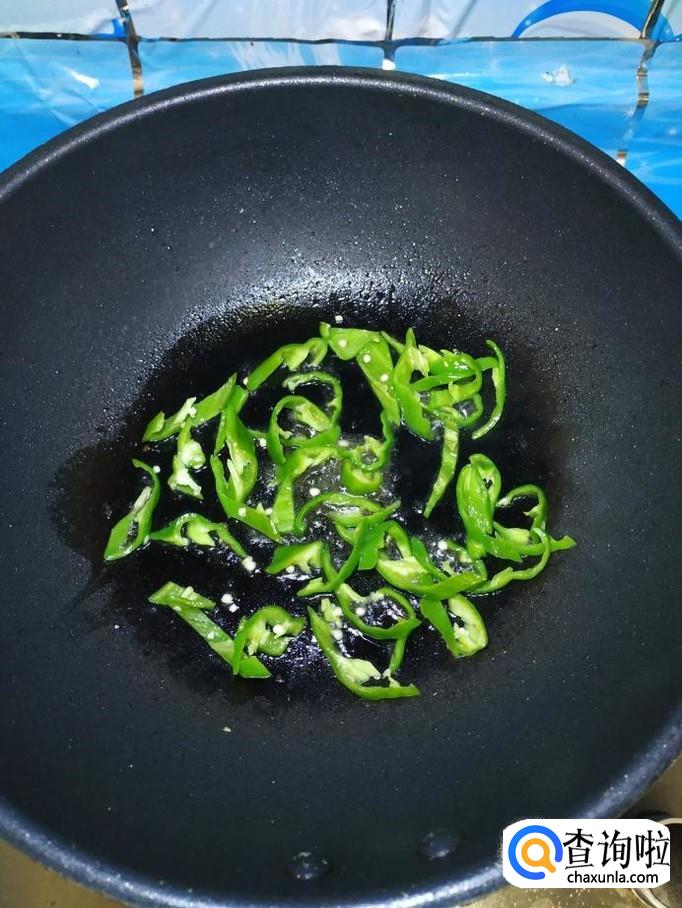 炒锅中放入适量油,油热后,将青椒丝倒入锅中炒香,炒至青椒丝变软就差不多了。