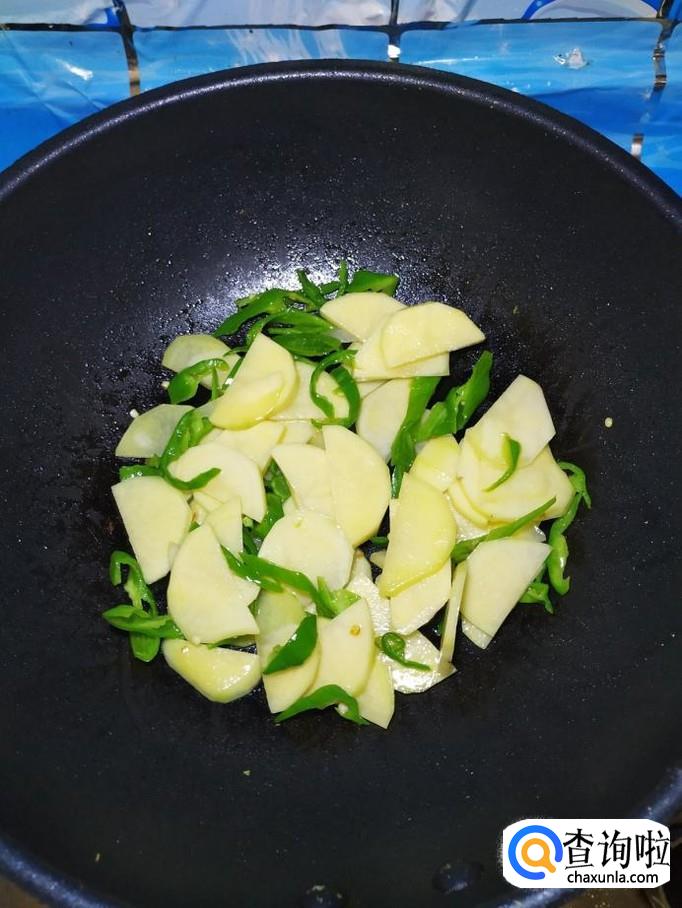 然后将土豆块倒入锅中,和青椒丝一起翻炒均匀。
