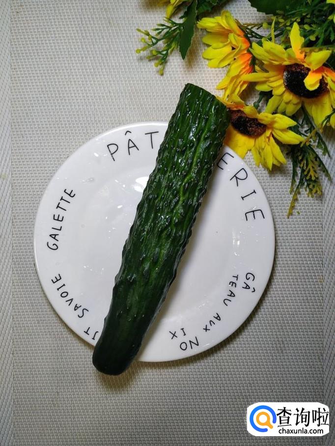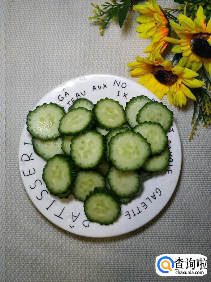 准备适量黄瓜,洗净后切成厚片,放入盘中备用,再准备适量青椒,洗净后切丝,放入盘中备用。