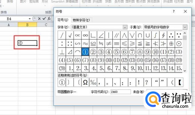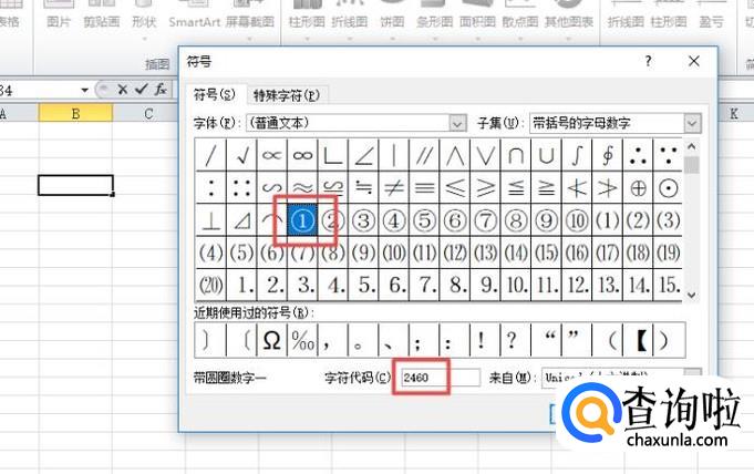 弹出的界面,我们在字符代码中输入2460,我们就可以看到带圈的数字了,我们点击插入;
