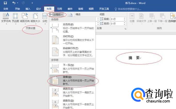 点击文档第四页文字部分,如图所示。点击"布局→页面设置→分隔符"图标向下箭头,弹出下拉列表选择"连续"项。