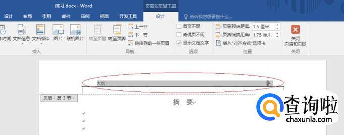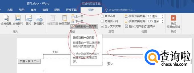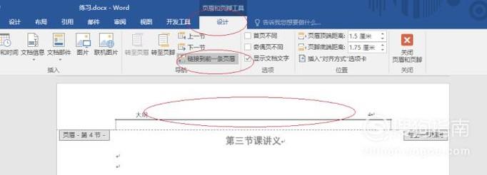 如图所示,双击文档第三页页眉部分。选择"设计→导航"功能区,点击"链接到前一条页眉"图标。