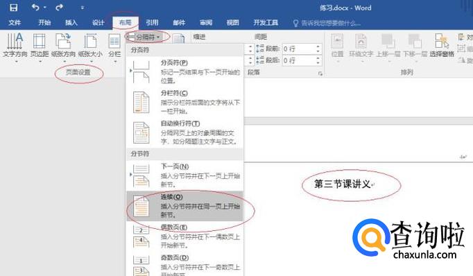 如图所示,点击文档第三页文字部分。点击"布局→页面设置→分隔符"图标向下箭头,弹出下拉列表选择"连续"项。