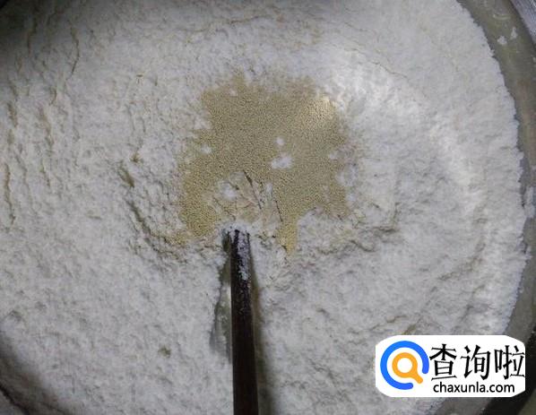 粘米粉放置盘子里,加酵母、泡打粉【这两个按说明下料】适量的白糖。