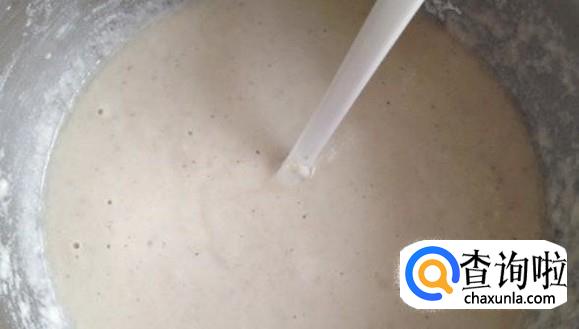 加水,水量不要太多,搅拌好用勺子装起,再慢慢倒出来,成一条不一断的线就可以了,然后盖住发酵5个小时左右。