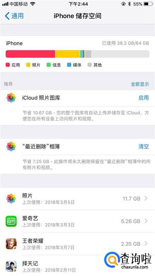 这时候我们就可以看到我们的iPhone存储空间的一些使用情况了。下面的一些app使用的内存情况,是按照排名情况进行排列的。
