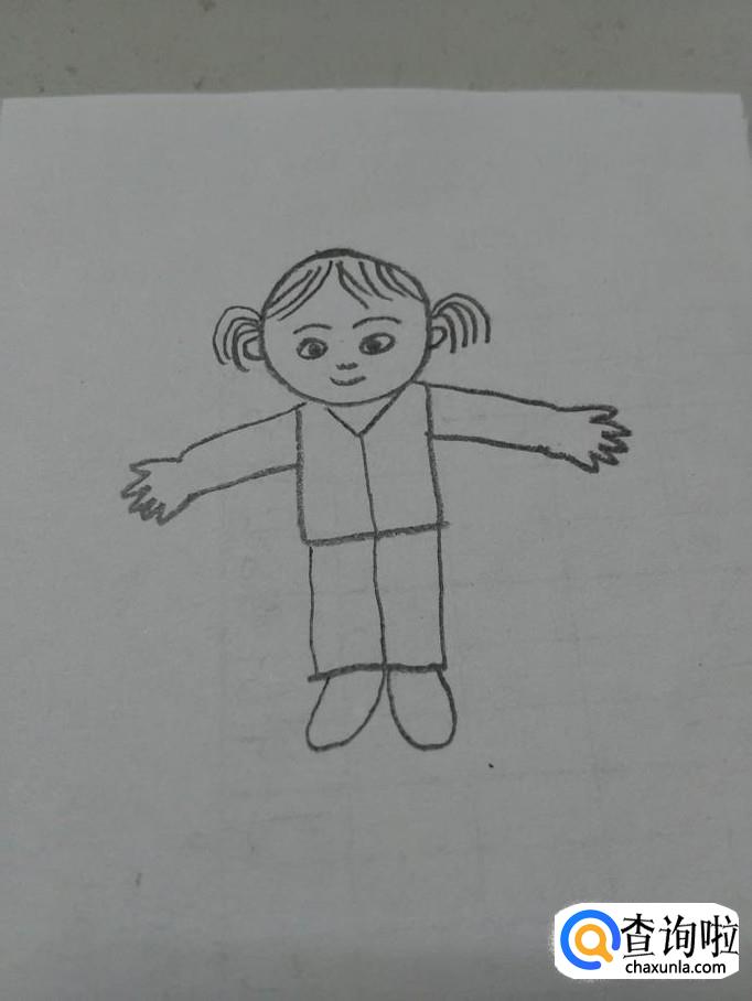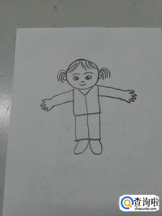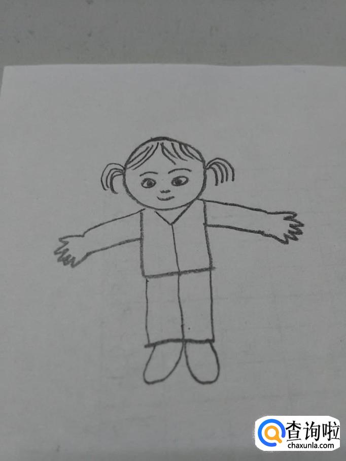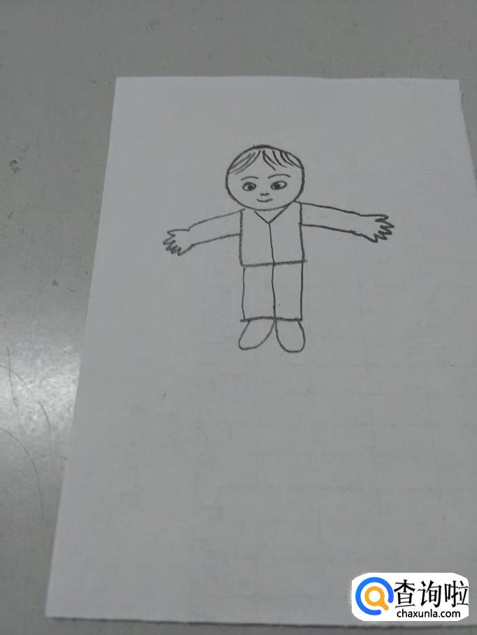 在裤子的下面,画两个椭圆形,表示鞋。到这里,一个男孩就画完了。