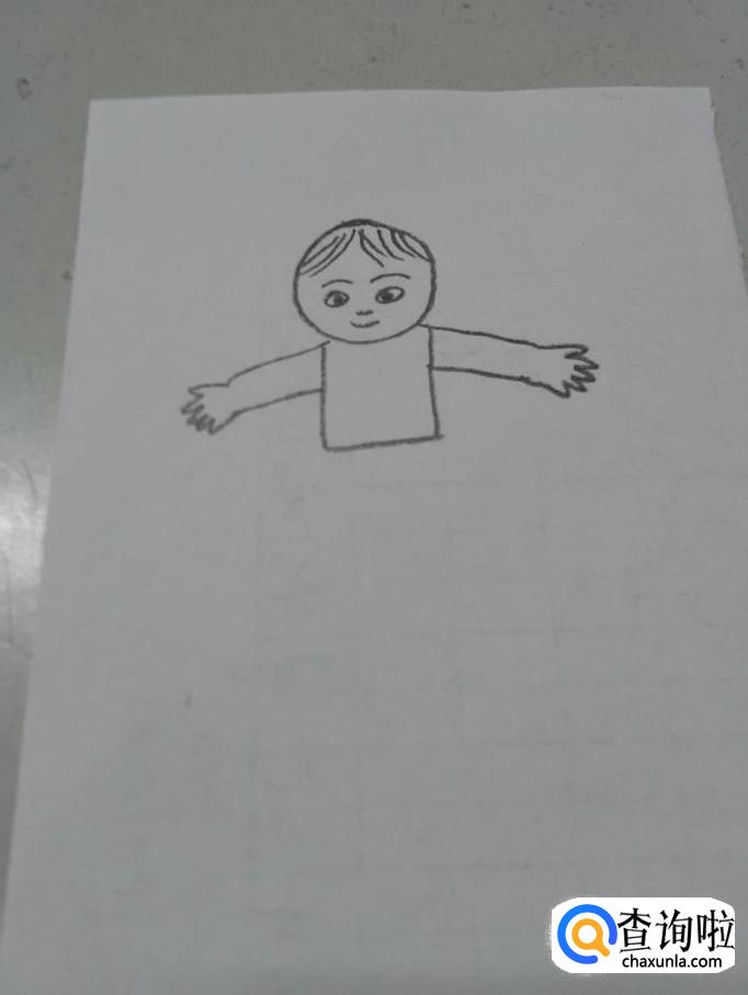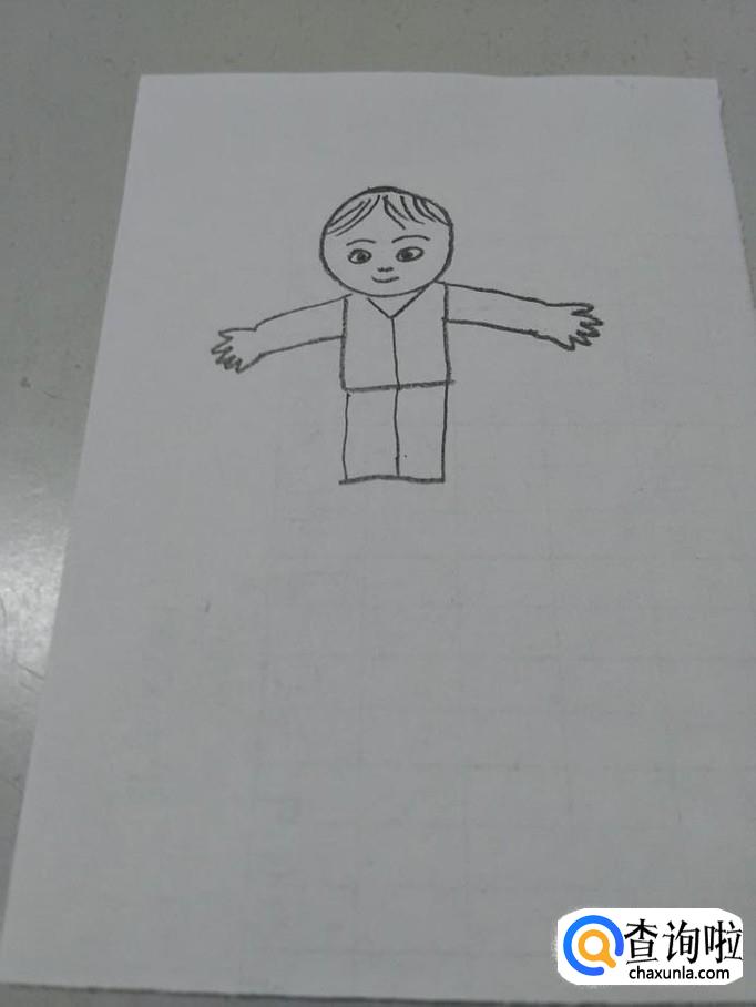 在上衣的下面,画两个连在一起的长方形,表示裤子。