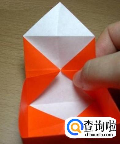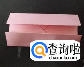 将翻折的四个角再向外翻折(角的顶点要在小正方形的边上)选择相对的两边,沿外侧两条竖着的折痕剪到与横折痕交点处,拉开,沿折痕折叠好。